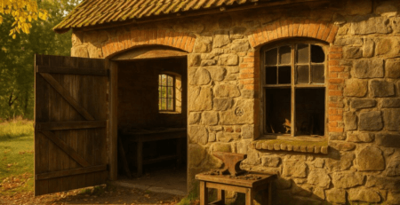 Steinbauernhaus mit offener Tür und einem Fenster, das auf einen Tisch mit einem Amboss zeigt.