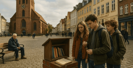 Vier Jugendliche stehen vor einem offenen Bücherregal auf einem Platz in einer Stadt.