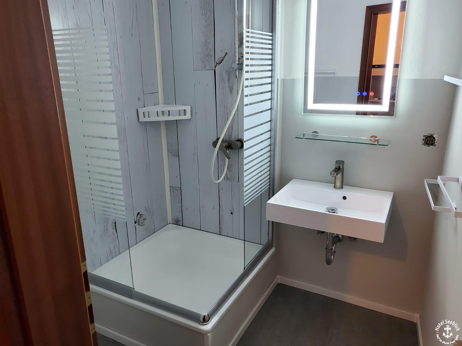 Ein modernes Badezimmer mit einer verglasten Dusche mit weißem Boden und glatten, vertikal gestreiften Wänden. Die Dusche hat einen Handbrausenkopf. Daneben befindet sich ein weißes rechteckiges Waschbecken mit einem Chromhahn, einer Glasablage und einem beleuchteten Spiegel darüber. Aufgabe geschafft!