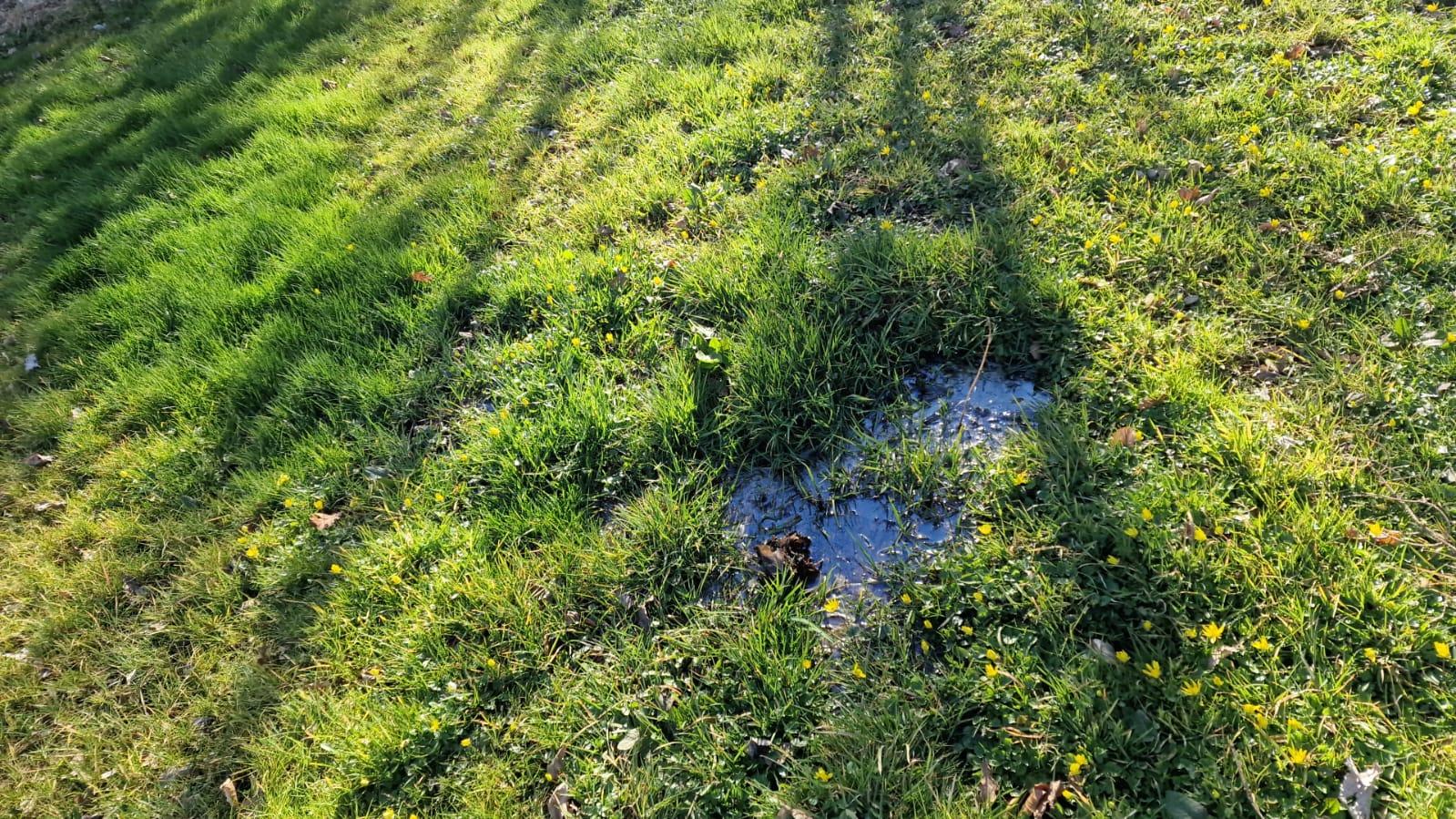 Es ist ein Loch. Mitten im Rasen. Voller Wasser. Braun.