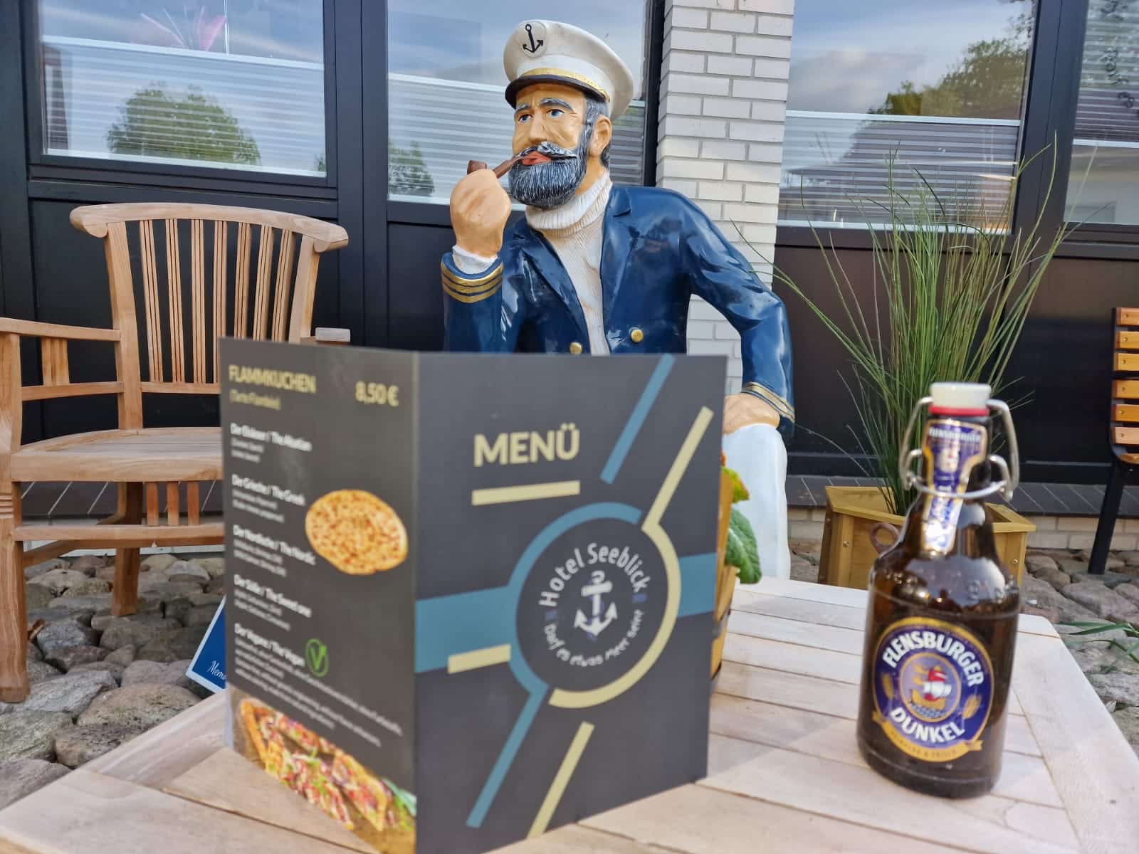 Ein Kapitän aus Holz sitzt neben einem Menü und einer Flasche Bier auf einem Tisch, ideal für Gastronomie-Visualisierungen.