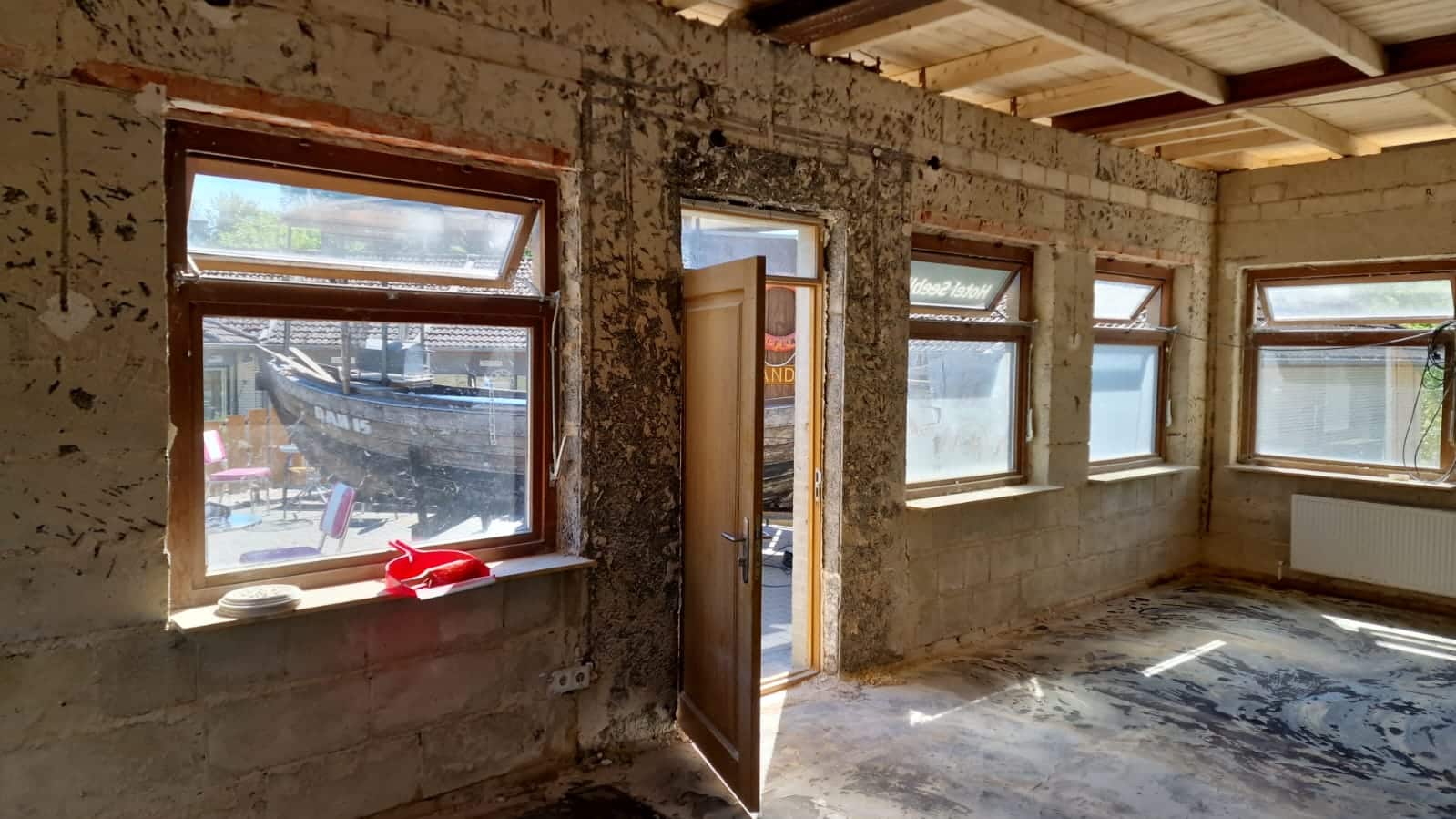 Die Wände unter dem Putz sind überraschend trocken, sodass wir hier gleich weiterarbeiten können. Die Fenster können noch ein paar Jahre durchhalten, natürlich entsprechend aufgehübscht und ertüchtigt.