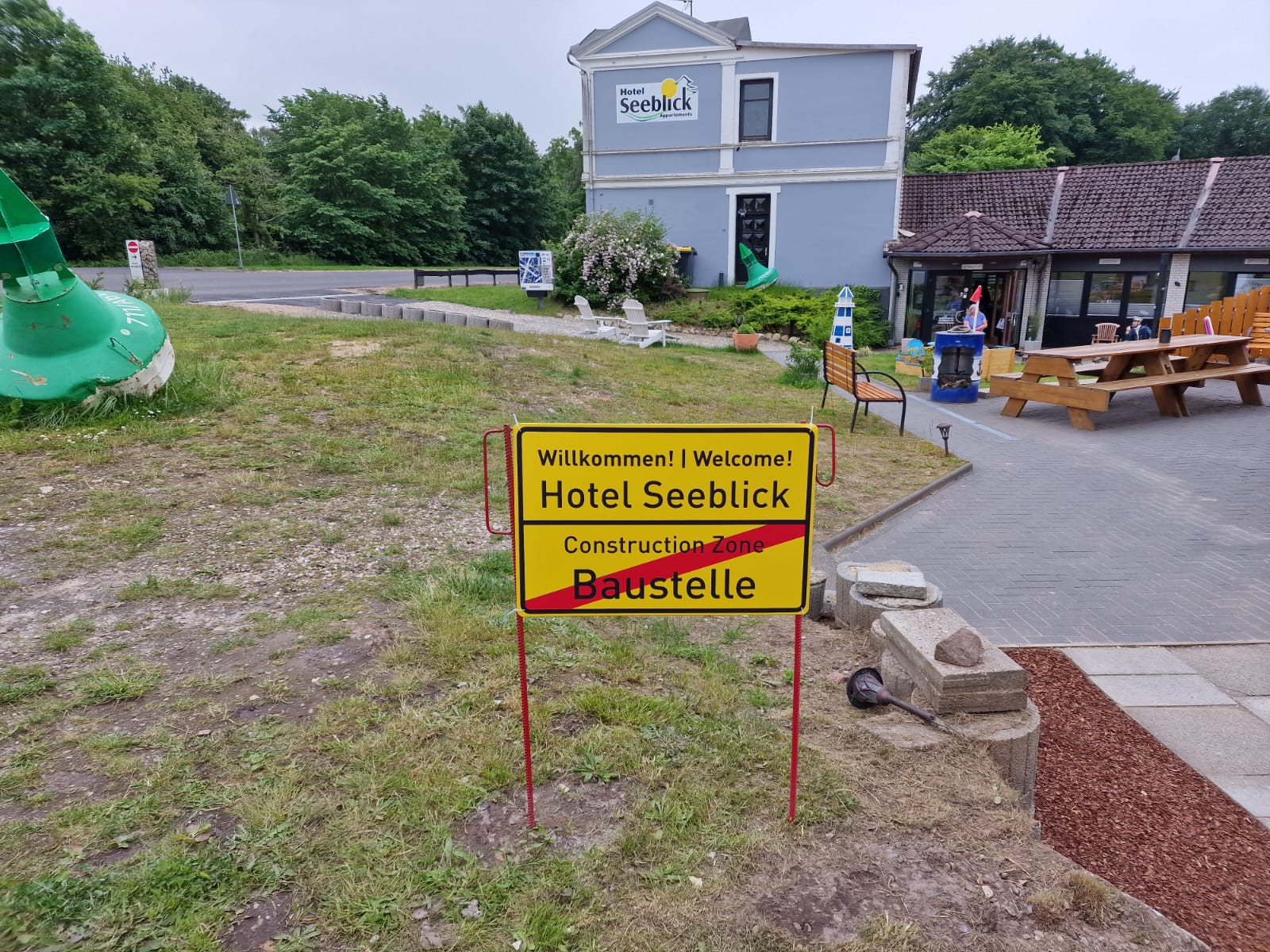 Auf einer Wiese steht ein zweisprachiges Schild in Deutsch und Englisch mit der Aufschrift „Willkommen! Welcome! Hotel Seeblick Baustelle“ dahinter. Hinter dem Schild steht ein Gebäude mit der Aufschrift „Hotel Seeblick“ mit einem Spielplatz, Picknicktischen und Bäumen im Hintergrund, die auf die geschäftige Baustelle auf dem Gelände hinweisen.