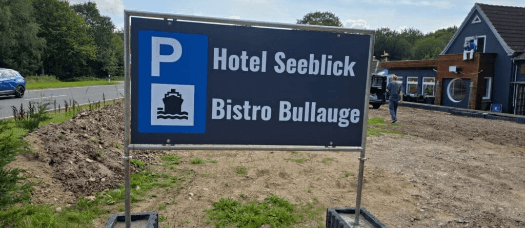 Nun haben wir endlich einen Hinweis auf unseren Parkplatz. Neben einer generell besseren Orientierung sollte es auch dafür sorgen, den Straßenverkehr etwas sicherer zu machen. Bisher bremsten manche Gäste doch sehr spontan, wenn sie die Einfahrt erblickten.