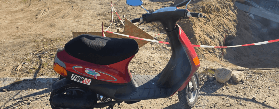 Roter Motorroller mit einem Aufkleber auf dem Sitz in einem Baustellenbereich.