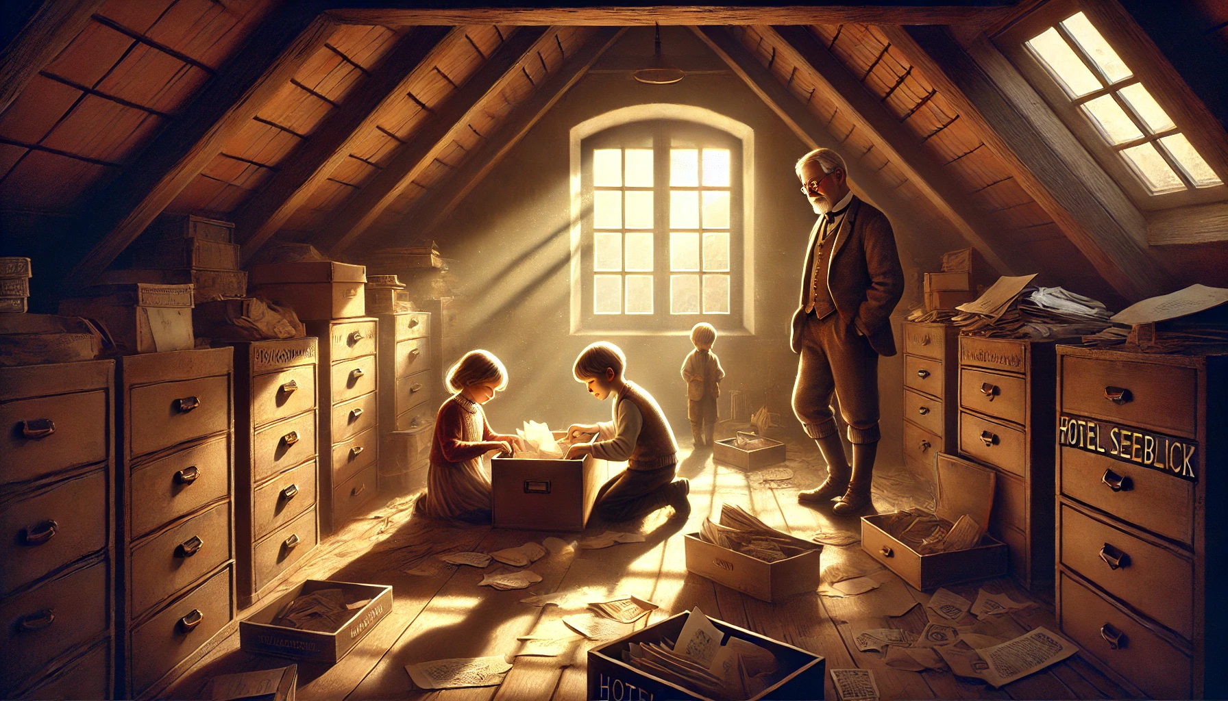 Sie gingen gemeinsam mit den Kindern in den Dachboden, der als Archiv diente. Staub lag wie eine dรผnne Decke รผber den Kartons und Regalen. Sonnenlicht fiel durch ein kleines Fenster und tanzte auf den alten Holzdielen.