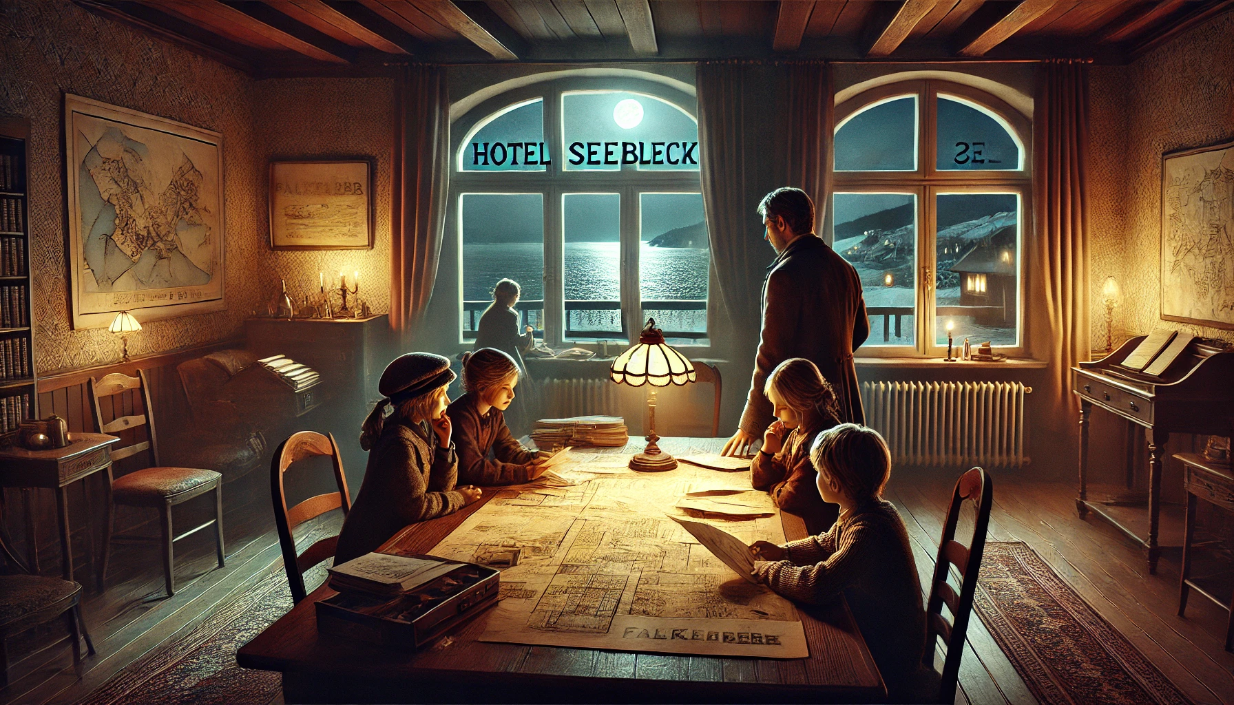 Die Nacht war klar, der Sankelmarker See lag still unter dem Licht des Mondes, als ob er sich ebenfalls zurückgezogen hätte, um zu lauschen. Im Leseraum des Hotels Seeblick brannte eine einzelne Lampe, ihr warmes Licht spiegelte sich auf dem alten Holztisch, auf dem sich eine Vielzahl von Papieren, Briefen und vergilbten Karten ausbreitete. Anna, Heiko, Frau Alva und die Kinder saßen um den Tisch, jede Bewegung begleitet vom Rascheln alter Dokumente und dem gelegentlichen Knacken des Holzbodens.