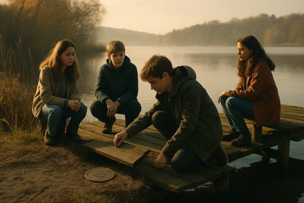 Sie begannen, den Bereich unter dem Steg zu untersuchen. Moos, lose Steine, altes Treibholz. Jonas kletterte vorsichtig unter die Planken, während Finn die Taschenlampe aus dem Rucksack holte.