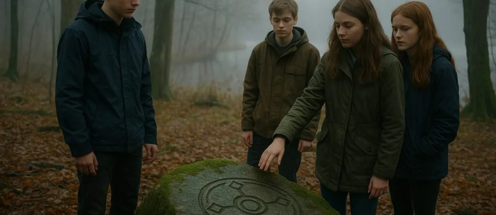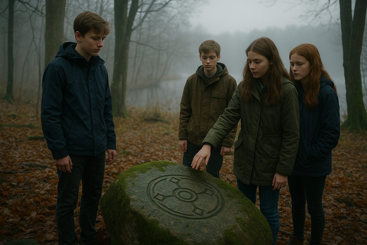 Vier Jugendliche stehen um einen großen, moosbedeckten Stein mit einem eingravierten Symbol im Wald.