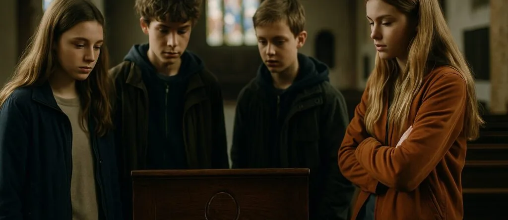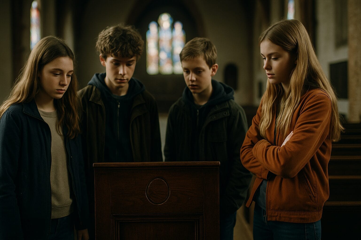 Vier Jugendliche stehen vor einem Holzpult in einer Kirche und schauen nachdenklich.