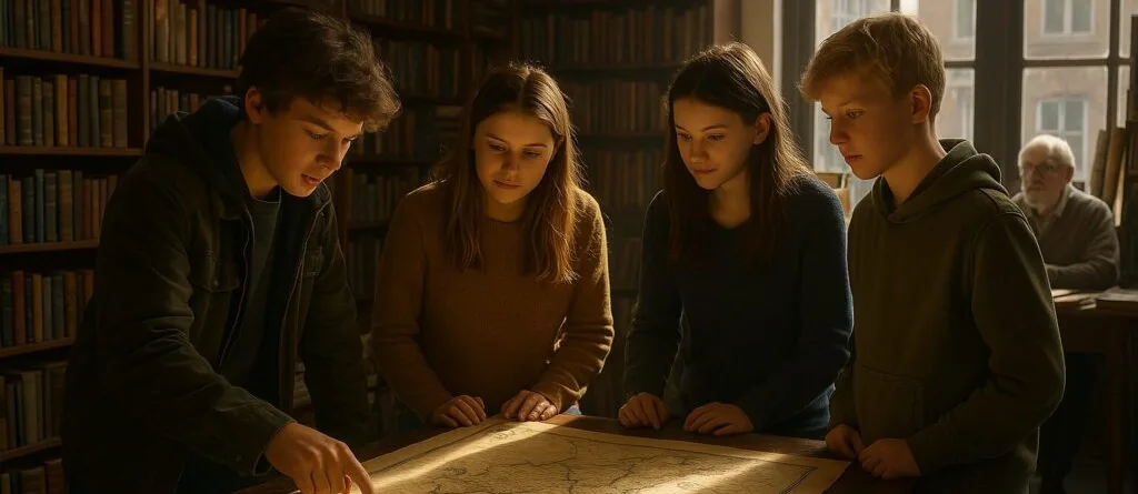 Vier Jugendliche stehen um einen Tisch und betrachten eine große Karte in einem Raum mit Bücherregalen.