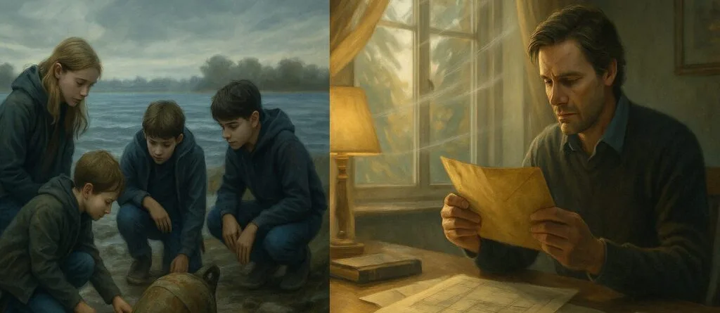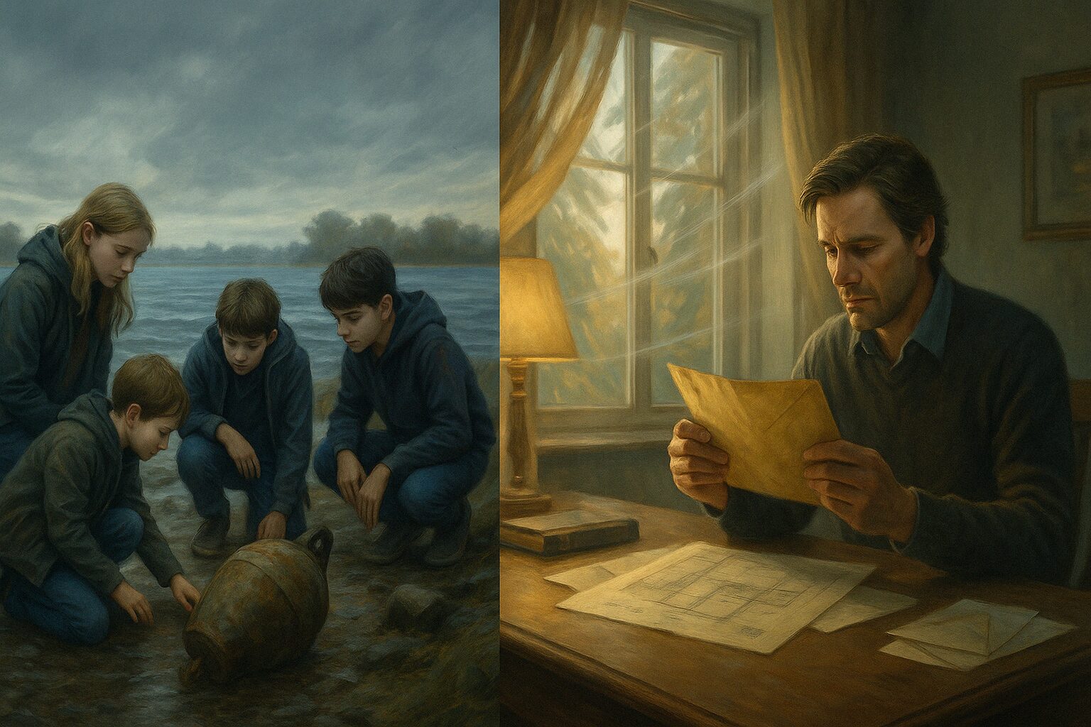 Ein Gemälde zeigt Kinder, die einen Topf am Ufer untersuchen, und einen Mann, der einen Brief an einem Tisch liest.