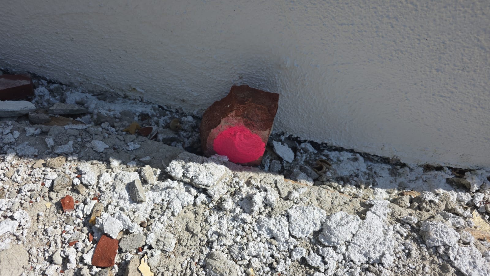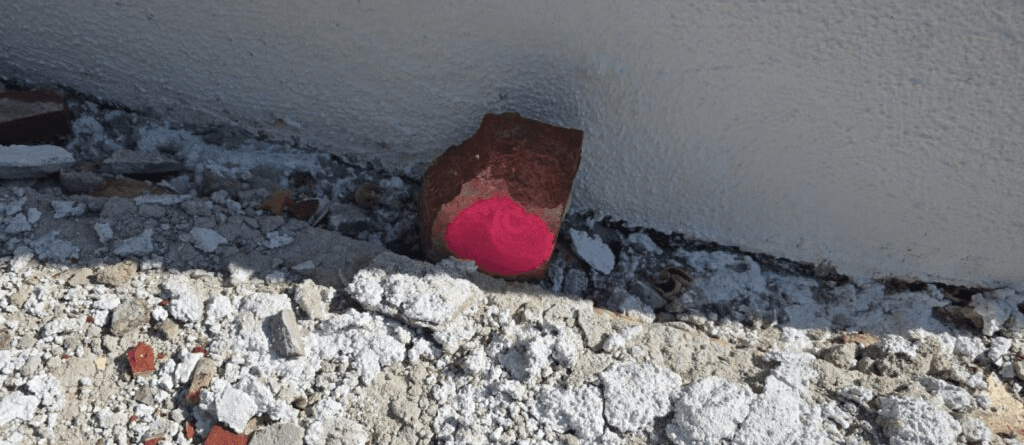 Ein roter Stein mit einem pinken Punkt, der auf einem grauen Untergrund liegt.