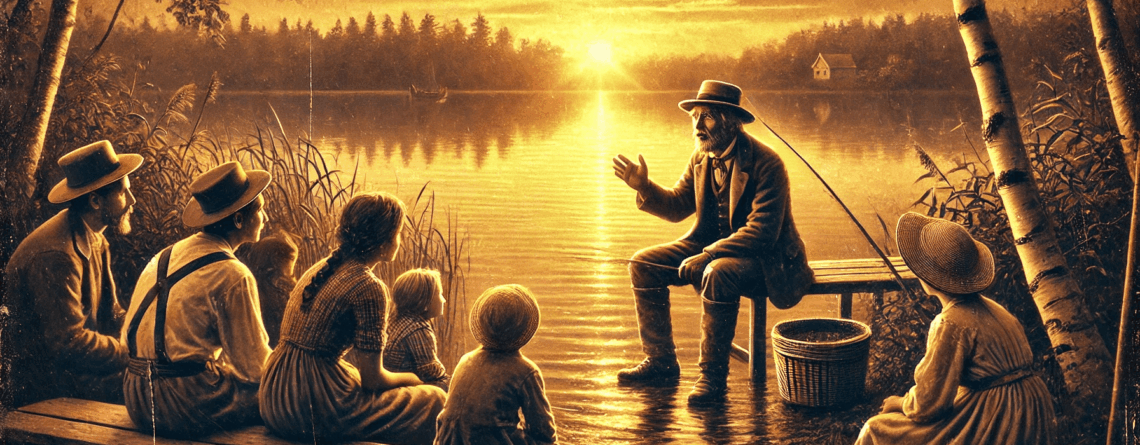 Ein älterer Mann erzählt einer Gruppe von Zuhörern am Ufer eines Sees bei Sonnenuntergang.