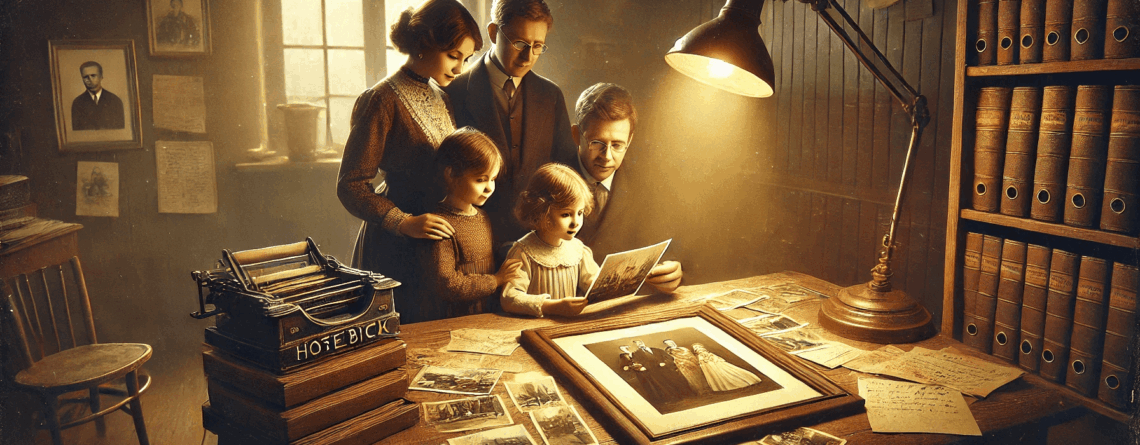 Familie mit zwei Kindern, die alte Fotografien in einem Raum mit Bücherregalen betrachtet.