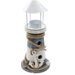 1 Rezension für Maritimer Teelichthalter Leuchtturm blau-weiß aus Holz mit Deko