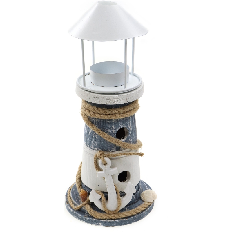 Maritimer Teelichthalter Leuchtturm blau-weiß aus Holz mit Deko