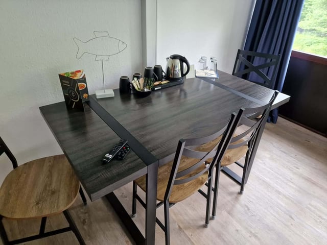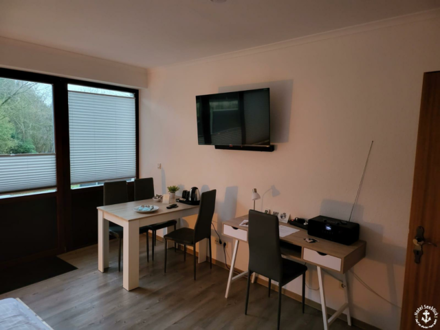 Ein modernes Hotelzimmer mit einem an der Wand montierten Flachbildfernseher. Unter dem Fernseher befindet sich ein sorgfältig aufgebauter weißer Schreibtisch mit Lampe und Stühlen. Neben dem Schreibtisch steht ein kleiner Tisch mit Teezubehör und zwei Stühlen neben einem großen Fenster mit Jalousien. Der Boden ist aus Holz.