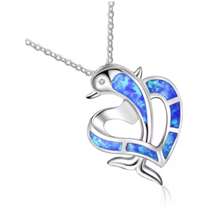 Silberne Kette mit blauem funkelnden Opal, 45 cm lang, Delfin in einem Herzen